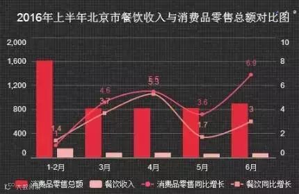 北京市上半年餐饮营业收入为433.8亿元,同比增长2.8%,低于零售品消费总额1个百分点。除1月份略高于零售品消费总额外,其余月份都处于落后状态,且6月份差距继续拉大至4.1%。北京市场即将迎来市场饱和的拐点。