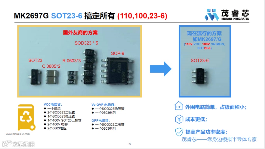 通过直观的比较,优化电路后,MK2697G一颗SOT23-6封装的IC可以替代上图左边12个器件,大大节省客户BOM,PCB面积,助力产品小型化设计。