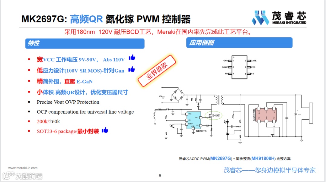 MK2697G是业界首款SOT23-6封装的高频QR控制器,目前仍是业界封装最小的氮化镓控制器;