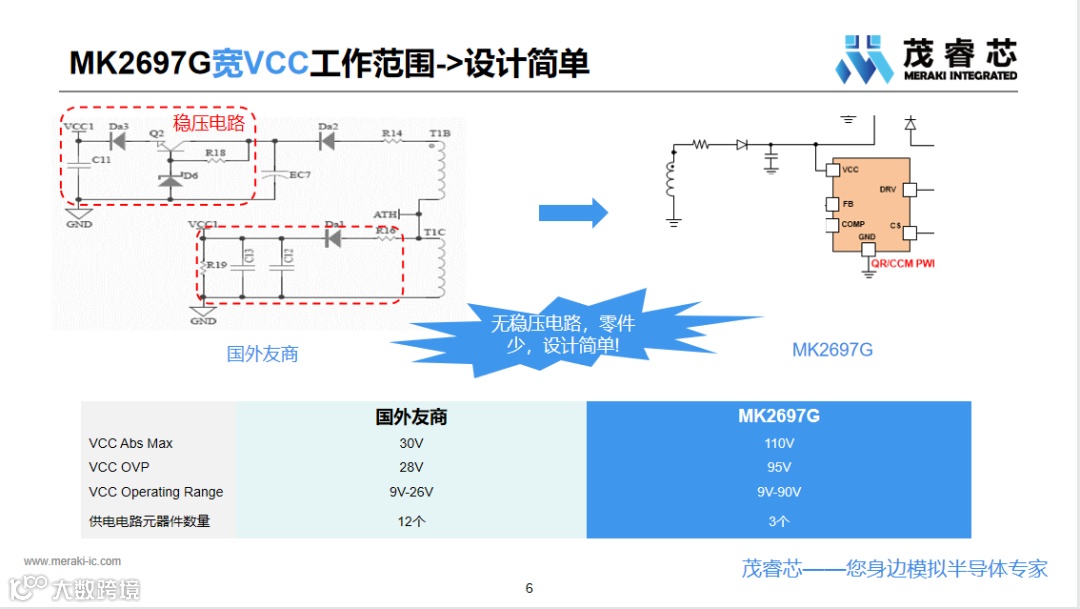 在Vcc设计了110V的耐压,保证9-90V的工作范围,在应用于宽范围输出时无需要增加额外的稳压电路;