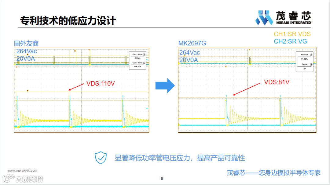 除了明显的BOM优势以外,性能也带来了明显的提升,采用专利技术的低应力设计,有效降低功率管应力,电压应力从原来的110V降低到了81V,极大提高了产品的可靠性。