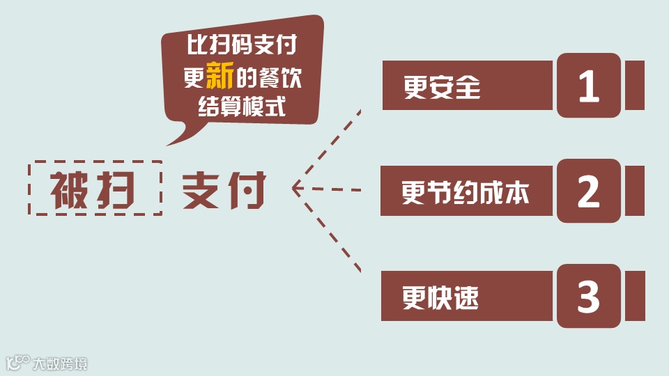 对比扫码支付,被扫形式节约二维码展示环节(打印/屏幕展示),流程更短,速度更快,尤其适合快餐业态