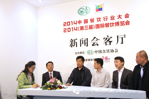 图为:天财商龙总裁丁晖在餐博会期间接受媒体采访