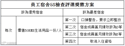 另外,为加强宿舍卫生管理,创造良好的住宿环境,员工宿舍5S检查最差宿舍将会与绩效挂钩,奖惩方案如下: