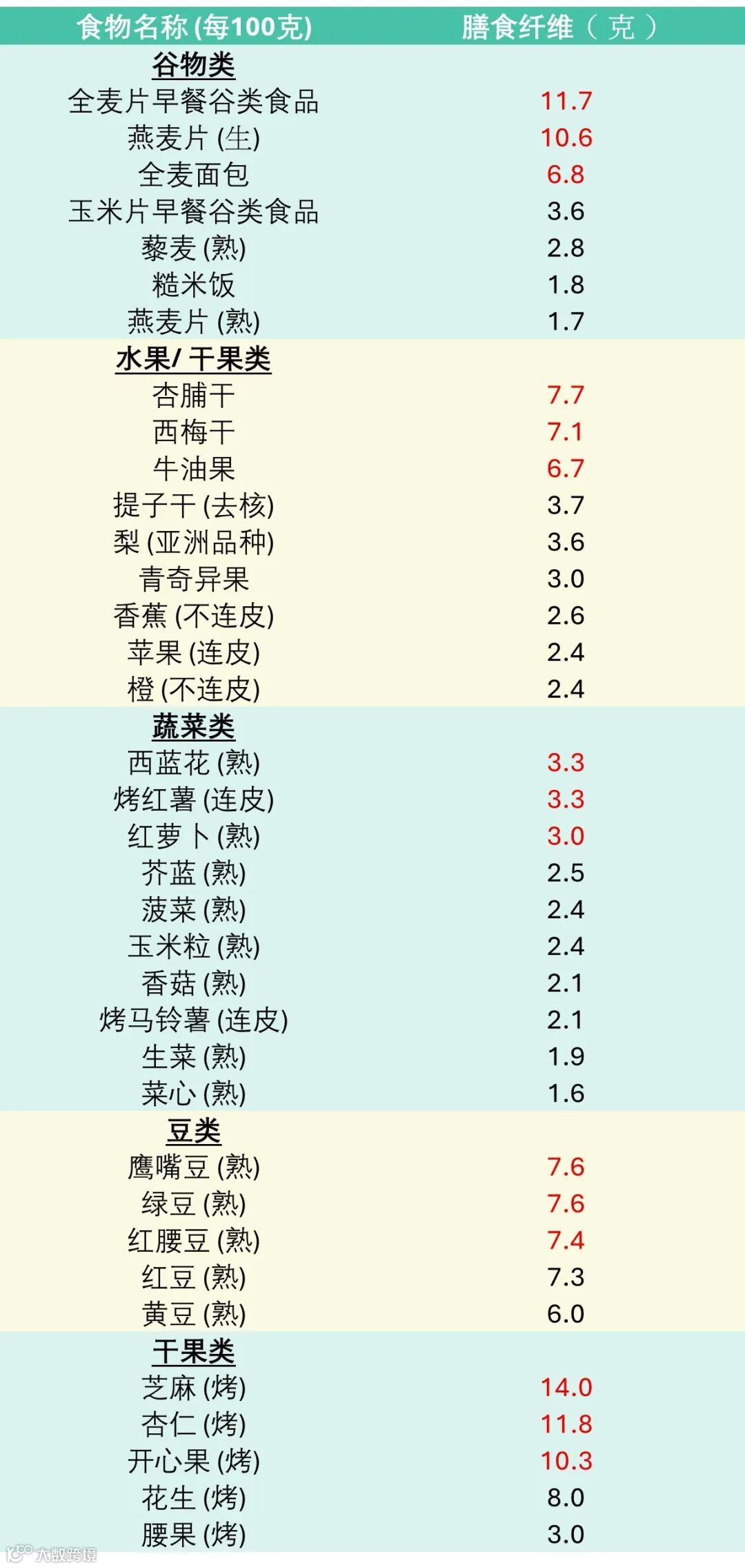 地中海饮食强调摄取大量的蔬菜、水果、全谷物、豆类、坚果和橄欖油,并适量食用鱼类、禽肉和乳制品,同時減少紅肉、加工食品和糖的攝取。 这一方式可以提供丰富的膳食纤维支持有益肠道菌的增殖,稳定短链脂肪酸代谢水平。下表列出各类食品中膳食纤维含量 [10],已按分类含量由高到低排序。