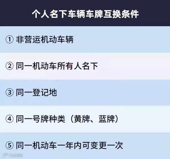 也就是说如果大家名下有2辆或以上的车辆,只要是车牌种类相同的非营运车辆就可以申请互换车牌。切记,该政策只适用于自己的车换自己的牌,不能跟其他人进行交换!