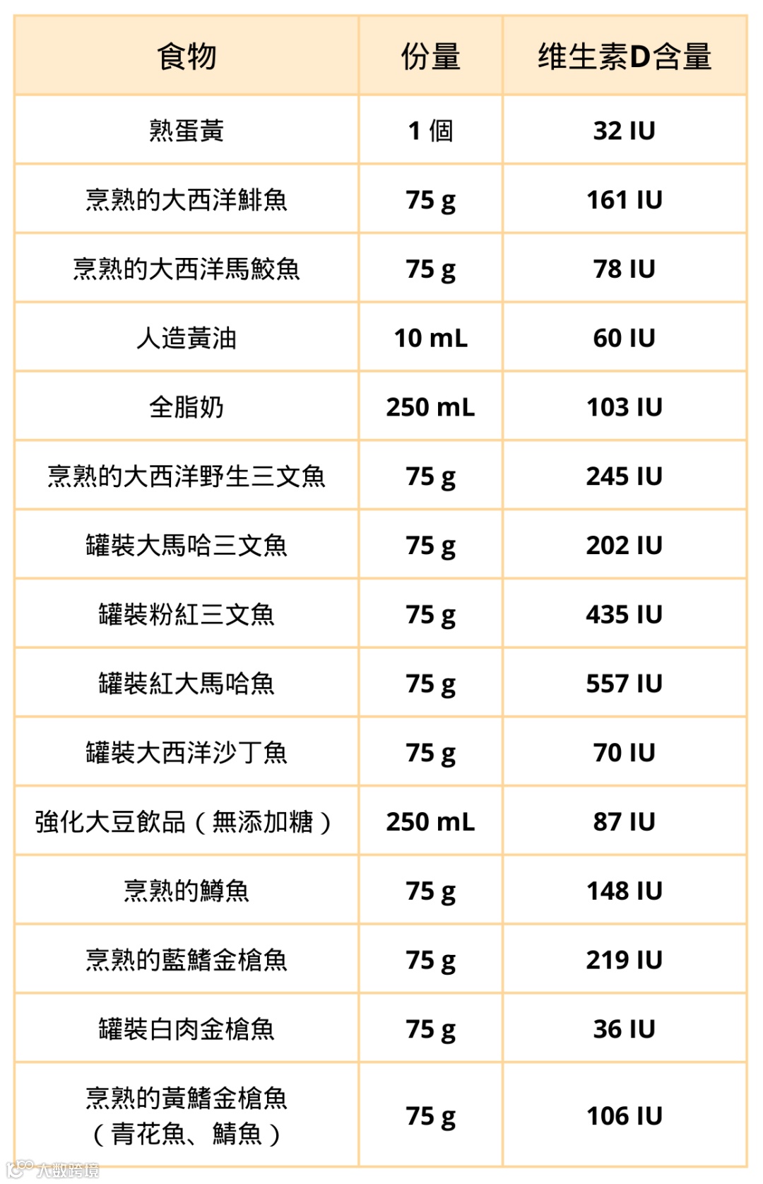 中国营养学会推荐65岁及以上老人每日最少摄入维生素D 600IU(国际单位),儿童及成人亦应摄入不少于400IU。此外,孕后期与哺乳期的妇女也要补充维生素D,以满足自身与婴儿需求。从上表可以看到,如果不是每日食用大量鱼肉,通过饮食摄取的维生素D,远远不够满足日常身体需求量,尤其是素食者,一定要通过其他途径设法加大摄入量。