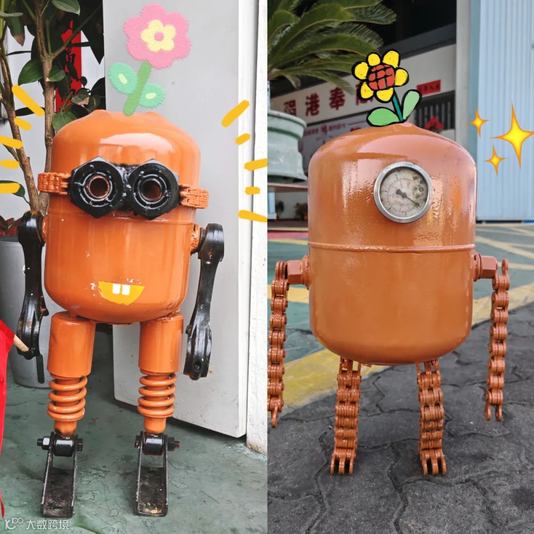 用废旧雪种瓶打造小黄人的身体,通过链条拼接成四肢,增加其工业机械的质感,仪表盘作为小黄人的眼睛,为作品增添了科技元素。整体设计完美融合废旧材料的再生利用与机械美学。