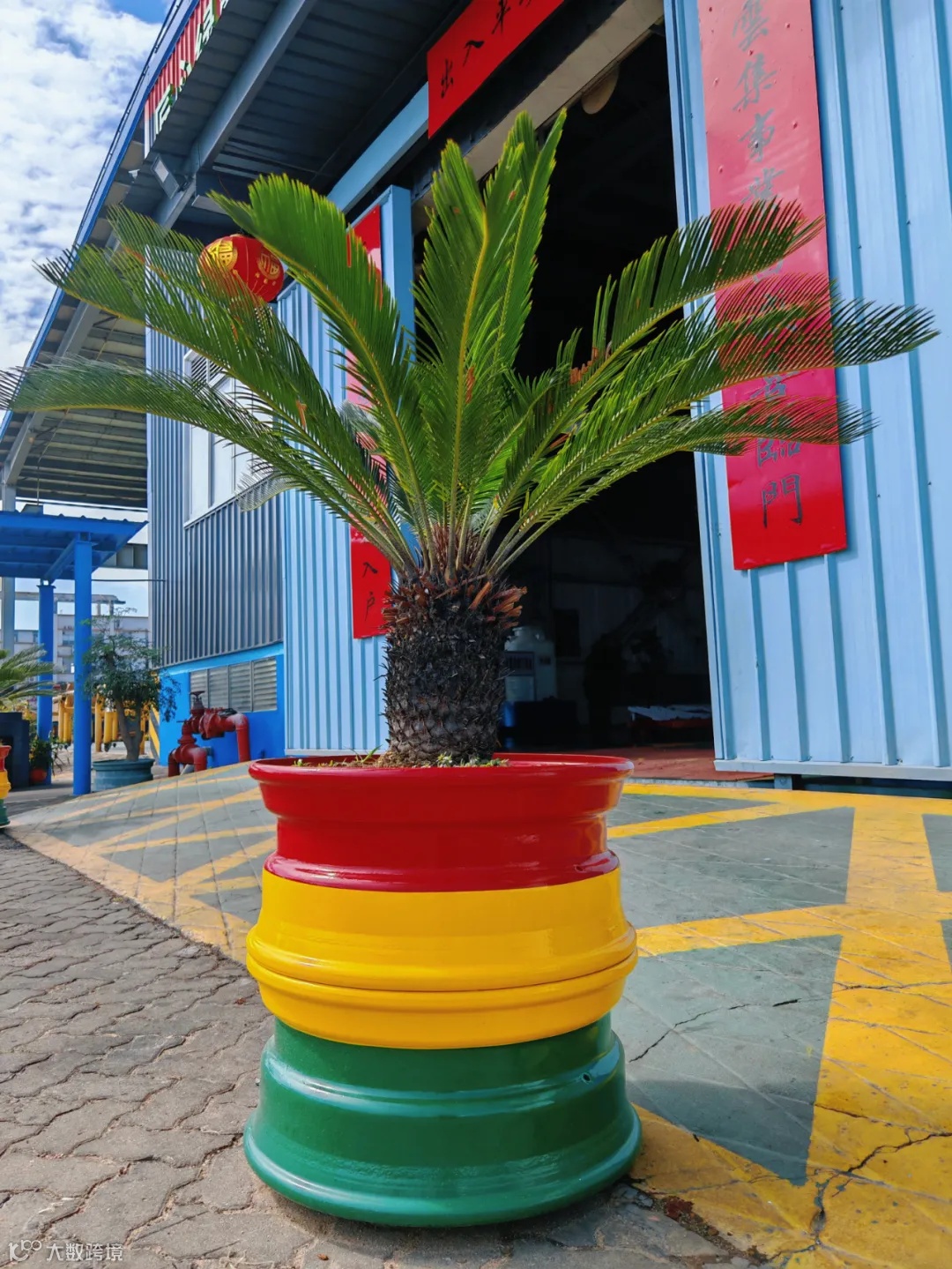 以废旧轮框为基底,拼接成彩虹色的花盆。轮框的金属质感与鲜艳的色彩形成鲜明对比,赋予花盆独特的工业艺术风格。底部保留轮框的孔洞设计,确保排水通畅。整体设计既利用了废旧材料的坚固性,又通过重新喷绘上色焕发新生,成为兼具实用性与美感的创意花盆,为维修中心增添一抹亮丽的风景。