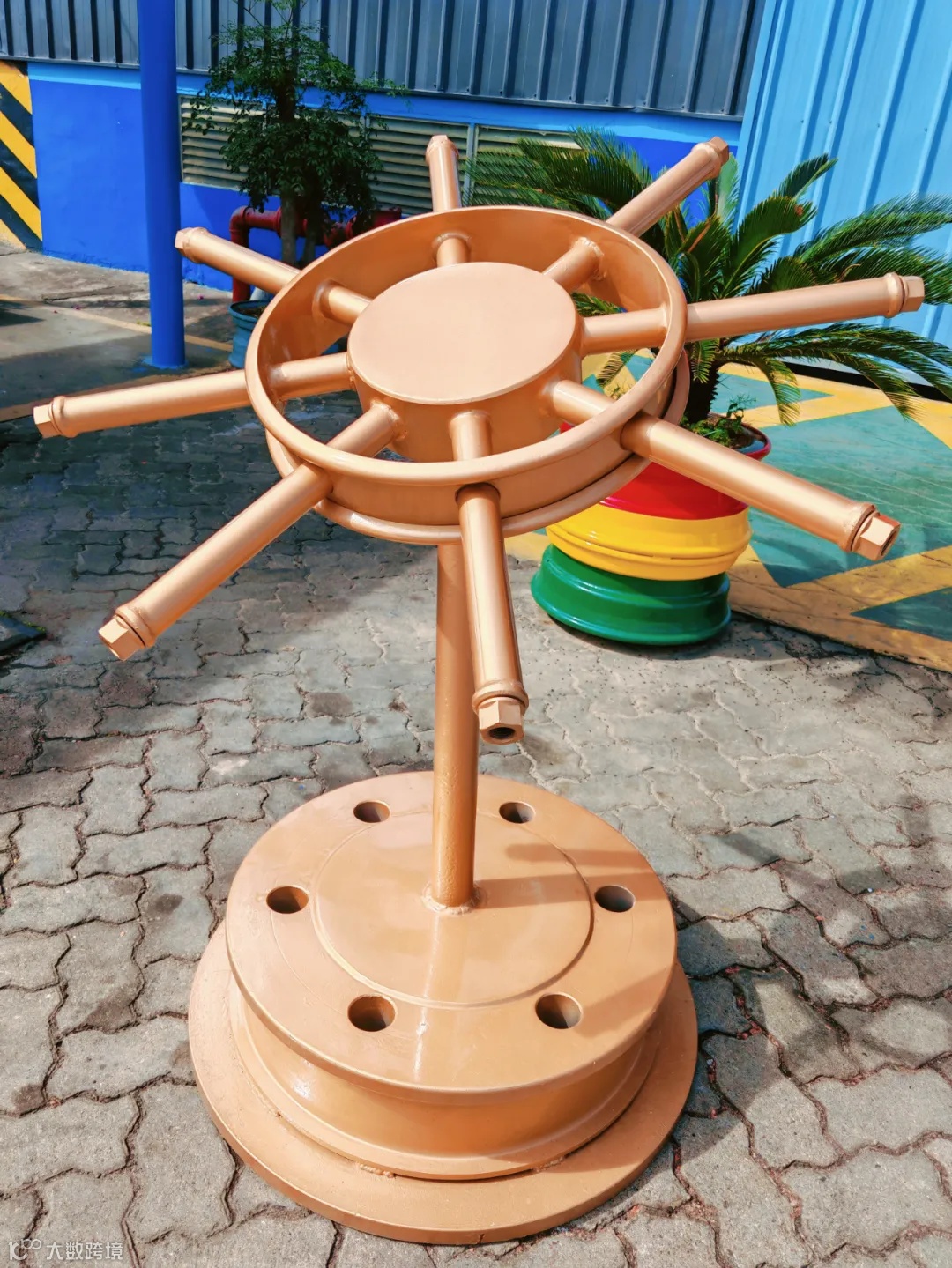以废旧滑轮作为罗盘的底座,轴承作为指针的旋转核心,钢管拼接成罗盘的外框,螺丝金属点缀细节,打造一个充满工业美学的船用罗盘。整体采用环保金属质感,体现建设“绿美港口”的生态理念。通过废旧材料的再生利用,既传递环保意识,又展现港口文化的独特魅力。