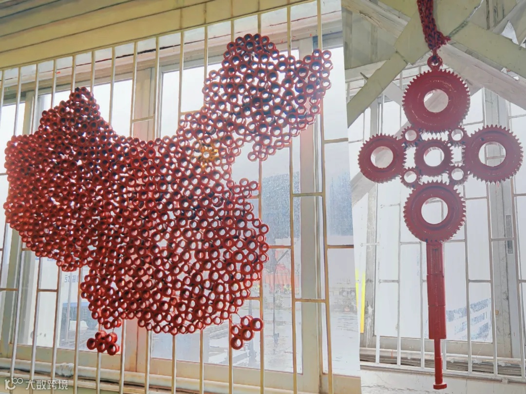 以变速箱齿轮和驱动桥轮边齿为原材料,打造一个独特的中国结造型,齿轮的精密结构与结的编织艺术相结合,象征着工业力量与文化传承的完美融合。中国地图用废旧螺母拼接,既体现环保理念,又展现祖国的山河辽阔。整体设计将机械精密结构美与中国传统文化的柔美结合,彰显匠心精神。