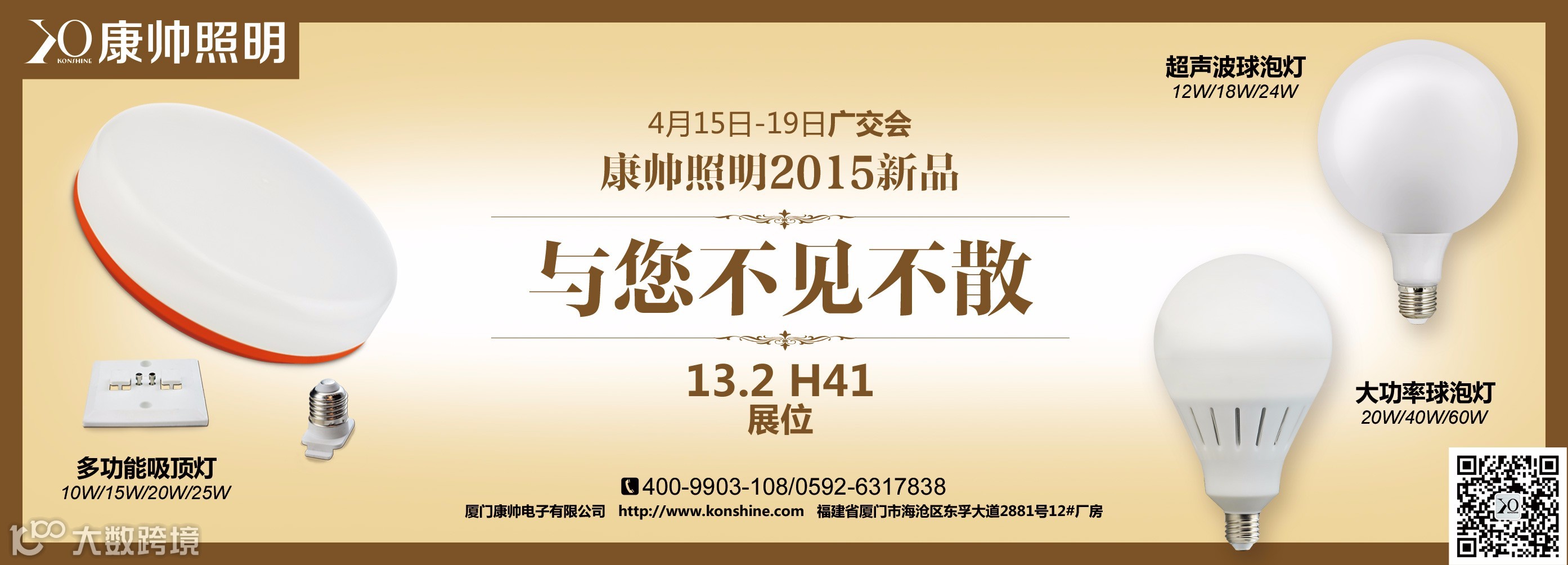 康帅照明作为本次广交会的参展商之一(展位号:13.2 H41),不仅拿出了可以代表康帅实力的产品,更是准备好了多款新产品。旨在向所有合作伙伴展示康帅的技术和创新实力。革命性创新多种便捷安装方式的多功能吸顶灯、自带散热小风扇的超亮大功率球泡灯、外观艺术美观的超声波球泡灯等等,带给大家的,将不只是眼前一亮,更是使用上的便捷,和更加环保的体验。