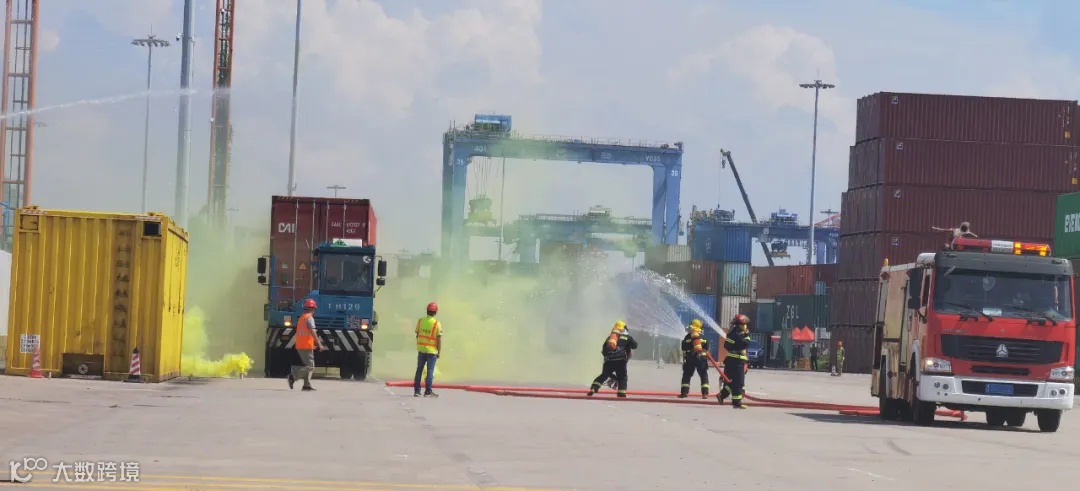 在港口设施保安及危险货物应急处置演练中,当发现危险货物遭遇“意外状况”时,各个应急小组迅速响应,紧密配合,即刻展开对危险货物的应急处置,并且通过与消防力量的紧密协同,顺利完成了应急处置任务。