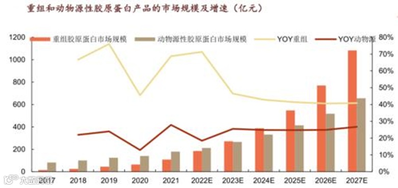 数据显示,目前重组和动物源性胶原蛋白市场规模分别为108亿元、179亿元,并且有持续上涨的空间。据弗若斯特沙利文预测,至2027年,重组和动物源性胶原蛋白市场规模分别有望达1083亿元、655亿元。