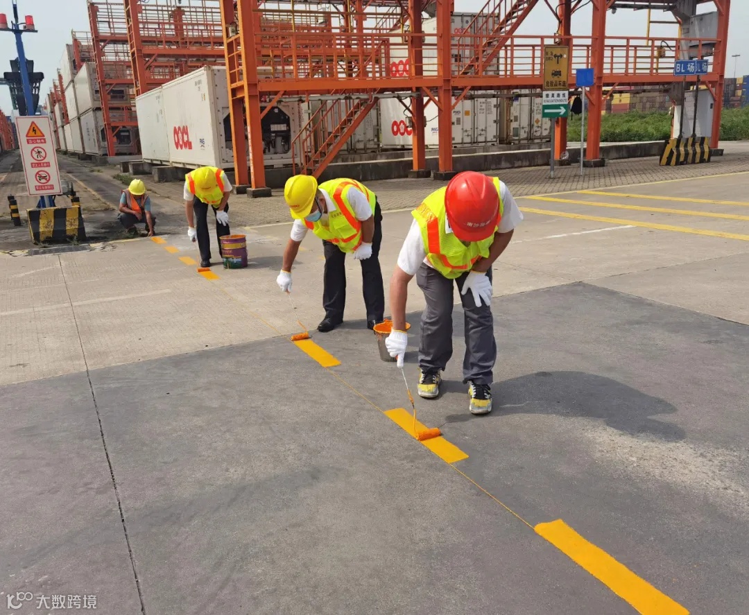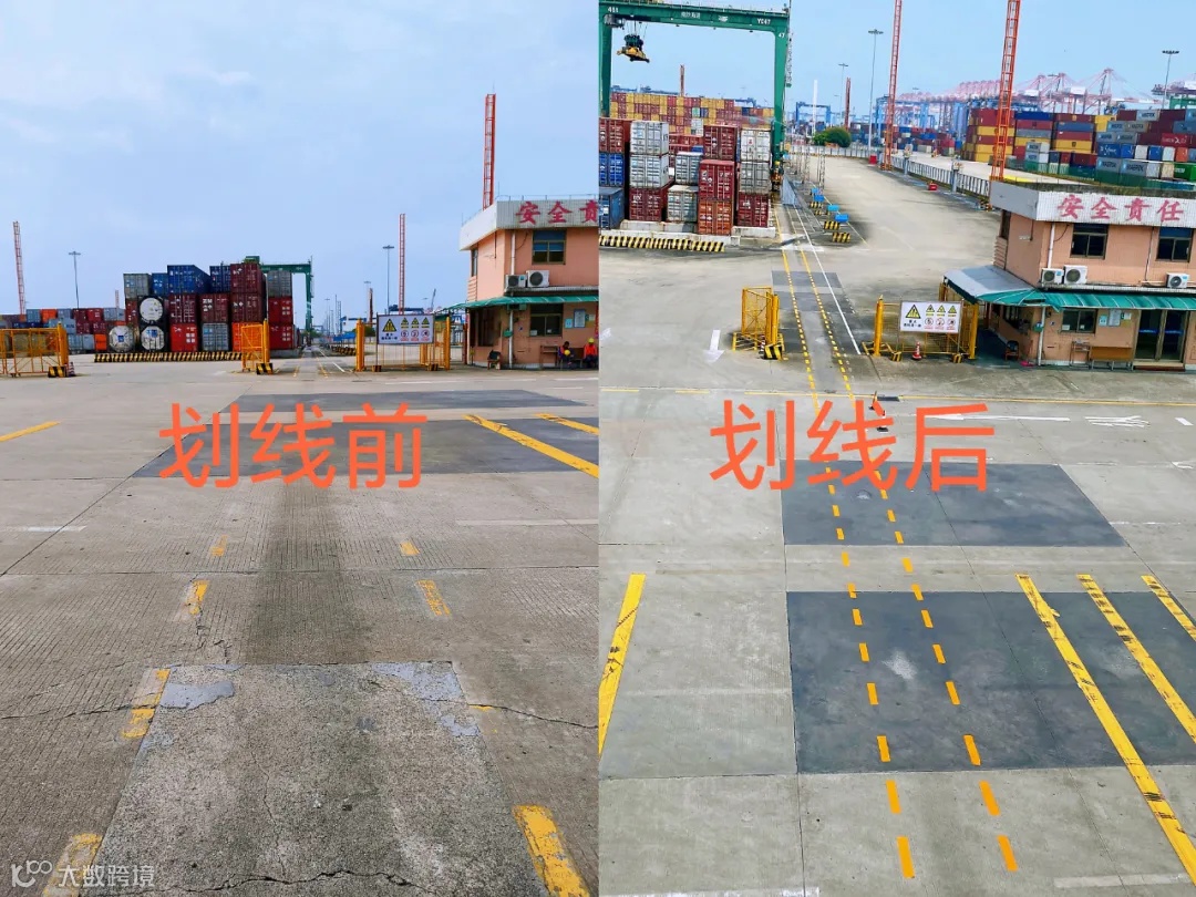 此次划线工作严格按照道路划线标准执行,包括原料稀释剂与漆料的配比度、标线的厚度与宽度等关键指标均达到要求。划出的黄色实线条线型清晰流畅、线条饱满均匀,不仅美化了港区环境,更为龙门吊的精准定位与快速作业提供了有力保障。