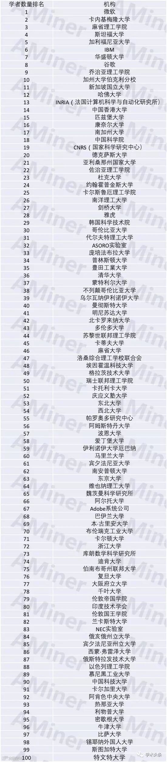 再获取21个子领域对应核心期刊和会议最近10年的论文,并从中挖掘出每个领域全球最具影响力的学者各100名左右。进而对这些学者所在机构进行分析,得出AI领域全球最具影响力机构TOP100如下表。