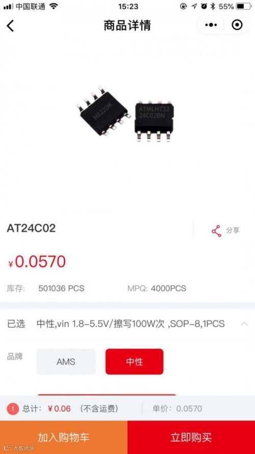 进入华芯商城GO小程序首页,可以看到目前小程序内热卖的元器件好料,点击立即购买即可在小程序内下单。