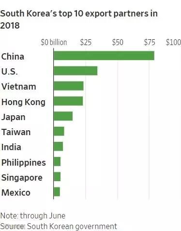 2018年韩国的十大出口合作伙伴,中国和美国位居前两位。和三星一样,韩国在商贸上十分依赖中国和美国。