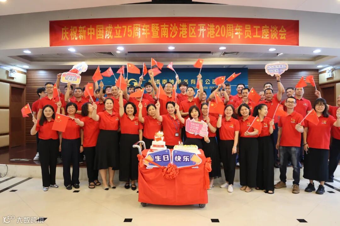 最后,在全体共唱《我和我的祖国》的歌声中,生日蛋糕被缓缓推出。在中华人民共和国成立75周年暨南沙港区开港20周年之际,全体参会人员一同祝贺祖国和公司生日快乐!祝愿伟大祖国繁荣昌盛,祝愿南沙港区蓬勃发展!