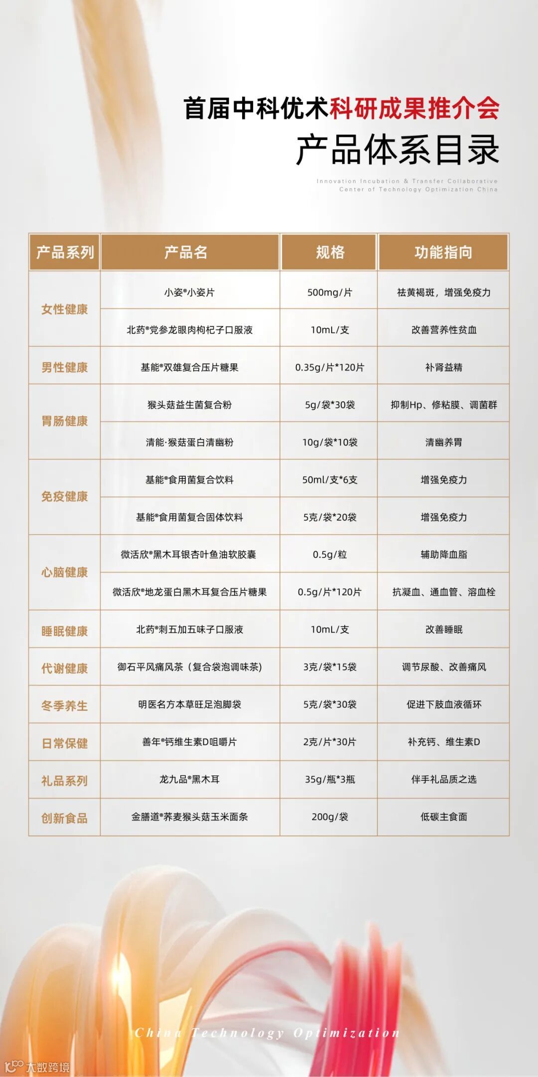 此次推介会将有10+系列具有自主知识产权和源头性创新技术的产品体系方案发布。这些产品涵盖了女性健康、男性健康、胃肠健康、免疫健康、心脑健康、睡眠健康、代谢健康、日常保健等涉及多领域、多营养功能及适用人群,科研价值与应用价值极高。下面,小编就本次推介会发布的科研成果产品体系目录进行统筹发布。