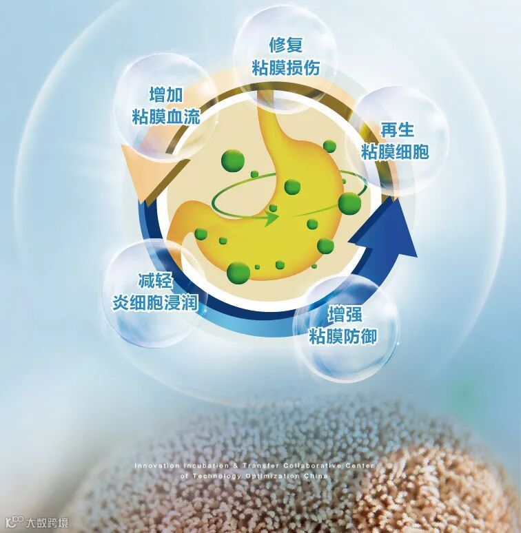 从方剂配伍角度而言,暖卫欣清幽粉所选原料均为药食同源,其中菌物药猴头菇提取物能保护修复胃黏膜损伤,促黏膜再生和溃疡愈合,整体调节胃肠黏膜免疫防线和机体免疫机能;海洋生物活性物质岩藻多糖能与Hp表面特异性蛋白结合,减轻炎症,保护胃黏膜,靶向清除Hp;植物药蒲公英提取物是天然植物“抗生素”,抗Hp效果与甲硝唑、阿莫西林相近;药理及临床研究证实,三者联用,既能抑制Hp,又能修复胃黏膜损伤,起到协同增效作用。