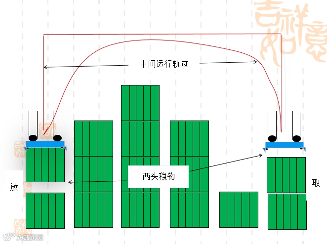 指的是装卸机械的取物器或是吊起货物运行的路线。取物器或是吊起货物在起吊30cm后二次确认安全的前期下,高速起升;在确认起升高度能安全跨过该呗位最高障碍物后,高速行驶小车至取物器或是吊起货物的目标位置;确认下方目标位置安全的情况下,高速下放取物器或货物,至目标位置上方30cm处停止。