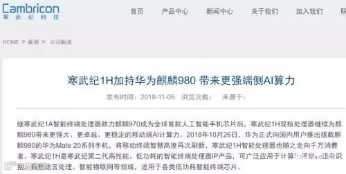 近日,寒武纪官方网站发布一篇题为《寒武纪1H加持华为麒麟980 带来更强端侧AI算力》的公司新闻,正式确认了华为麒麟980的双核NPU是来自于寒武纪1H的IP。