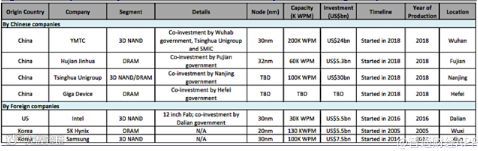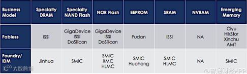 中国公司兆易创新历来是NORflash的供应商。最近,该公司并购了ISSI,现在也供应专业的DRAM和NAND。但考虑到这整个市场基本被三星、海力士以及美光三大厂商垄断,未来一段时间内,兆易创新想要进入DRAM和NANDFlash全球市场第一梯队十分困难。该公司又从东芝购买了SLCNAND(SLC为NAND闪存架构),并与博通、漫威、高通和英特尔公司之间有合作。图2名单包含了有/没有晶圆厂的中国公司。