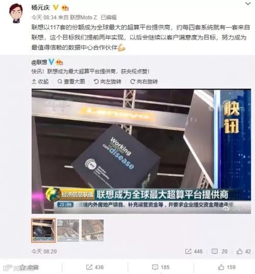 今晨(6月29日),联想CEO杨元庆转发官微喜讯称,央视《经济信息联播》中点赞联想,因为后者成为了全球最大的超算平台提供商。