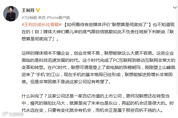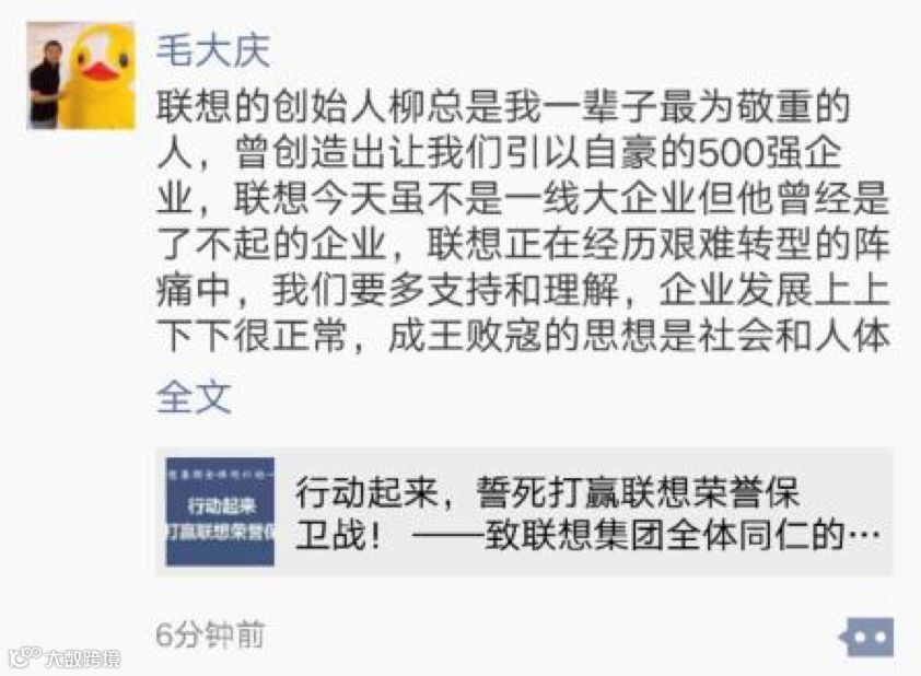 至此,在联想内部信发出后,除了华为,还有包括SOHO中国董事长、联合创始人潘石屹,优客工场创始人董事长、万科集团外部合伙人毛大庆,新浪董事长兼首席执行官、微博董事长曹国伟、阿里巴巴集团资深副总裁、阿里云总裁胡晓明,奇虎360公司董事长周鸿祎等在内的中国半数大咖级企业家都出面力挺联想。