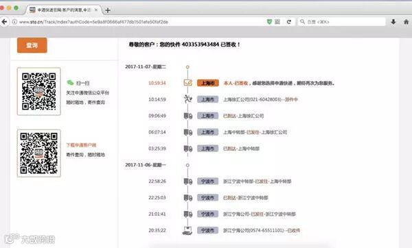 11月7日中午11时30分许,记者再次登陆“申通快递”官网,查询显示,这个单号为“403353943484”的快件状态显示“11月7日10:59:34,本人已签收”,而此前每一个流转节点的信息都被详细记录在“申通快递”官网的“运输信息”里。