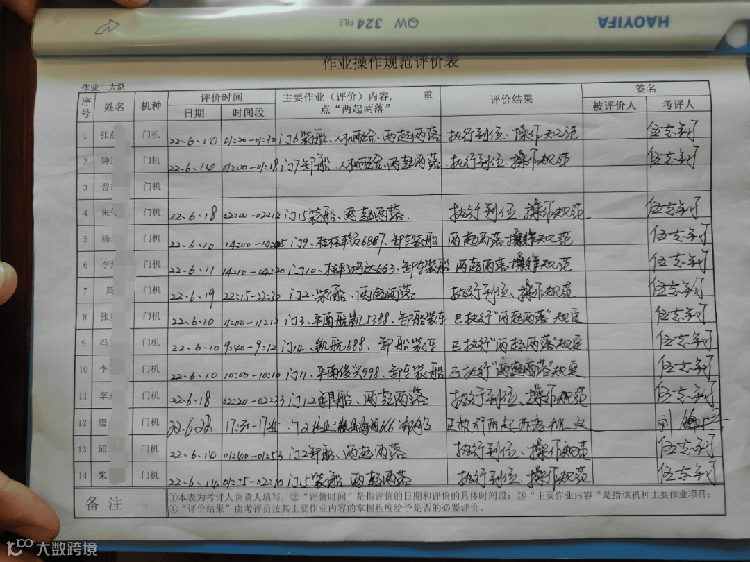 结合公司安全活动月的要求,作业大队在6月就启动对全体机械操作司机进行作业操作规范评价,要求作业大队管理人员以“蹲点”方式,观察司机5~7吊或15~20分钟的操作,对每一个机械司机的规范操作进行评价(重点:两起两落)。评价完成后填写评价表上交部门,在评价过程中发现的问题及时与司机进行沟通并予以纠正。