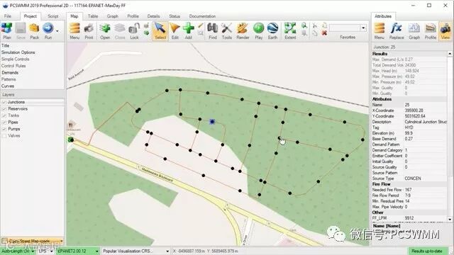 改进新的fire flow分析工具,EPANET运行后的结果属性生成(计算时间序列统计),用于查询,地图渲染或表格分析,在地图链接上显示泵和阀门图标,更好地支持编辑需求,以及优化 在“地图”面板中加载用于绘图和回放的时间序列。