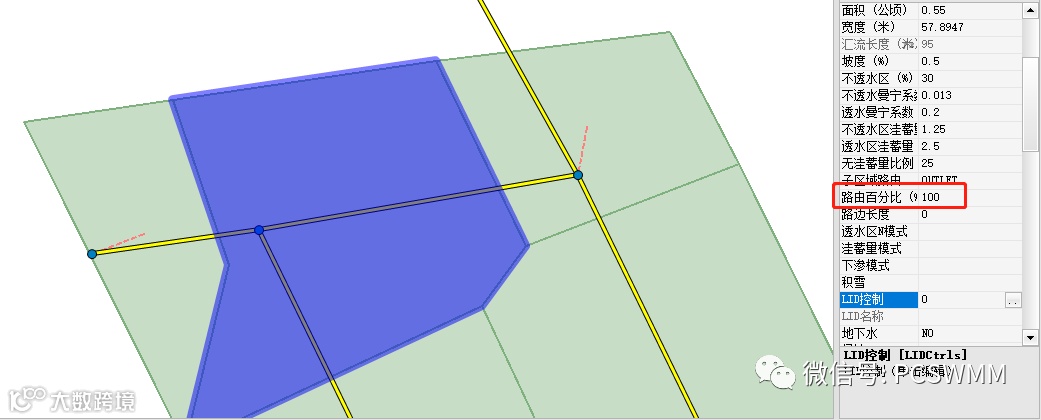 • 在子汇水区图层中,还有“路由百分比”属性,该属性表示子分区的径流流到其他子区域的径流量占该子分区的面积的占比,以百分比表示。