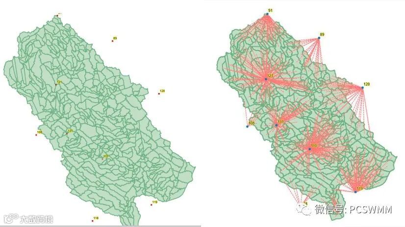 采用最小距离法,找出每个子汇水区对应临近的站点位置,并批量设置子汇水区的出口为“最接近汇水区形心的点”,如此便赋值了每个出口。将出口属性批量转换为雨量计属性,即快速完成了汇水区与雨量计的关联。
