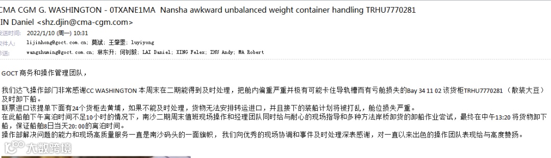 1月8日中午,随着“达飞华盛顿”船上指挥手的一连串指令,南沙港务海港桥19司机马上收住吊具,停止了舱底卸船作业。作业暂停的原因在于此柜因偏载严重,在之前多名桥吊司机经过反复尝试,都因存在卡槽风险而暂缓作业。现场作业当班管理人员经过多方考虑,为安全起见,初步决定弃卸此柜,为此公司高度关注该柜的作业动态。