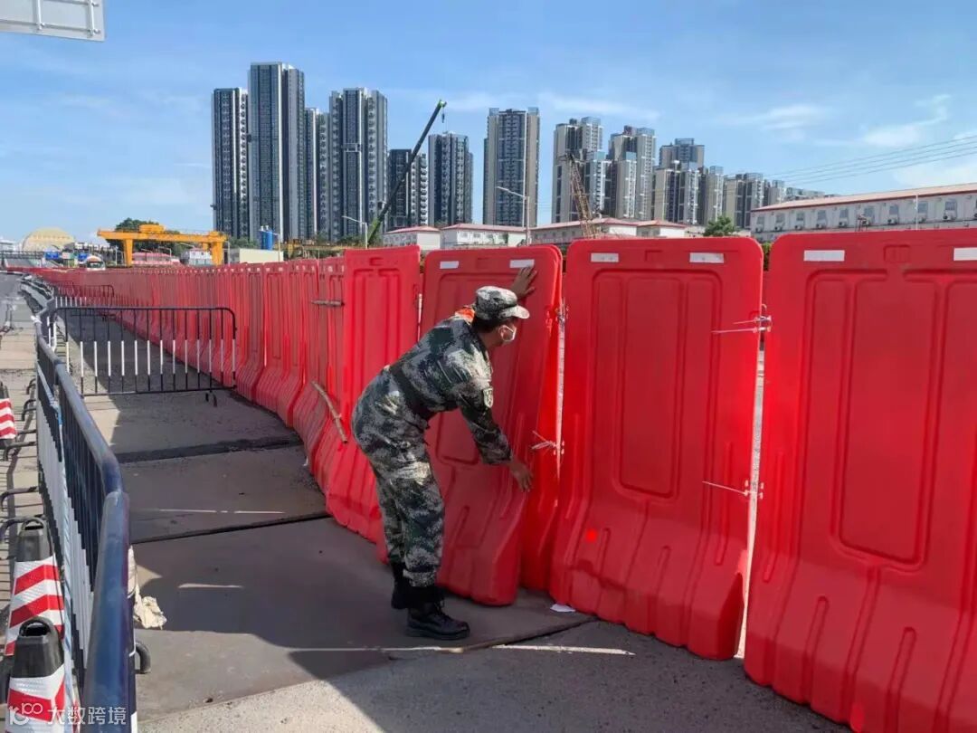 广州的夏天晴热与暴雨交替。暴雨过后,围蔽的水马已经东倒西歪。荣国和组员又顶着雨后的烈日,扶正紧固水马,几公里的水马处理完成时,他们已经无法分清身上的是汗水还是雨水。20多天,每天都是36°C以上的黄色高温天气,每天都是长达十几小时的抗疫执勤工作,作为退伍军人的荣国也感到十分疲惫,累了就靠着墙休息几分钟,汗水渐渐成了衣服上斑斑点点的盐渍又变成了衣服上的点缀,正是如王荣国这样的抗疫人员,用他们的一双双手和无尽的汗水筑起一道道防疫的长城。