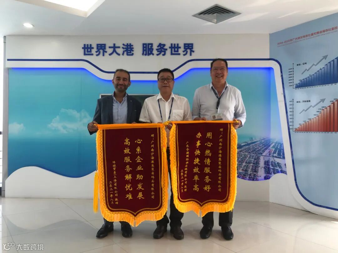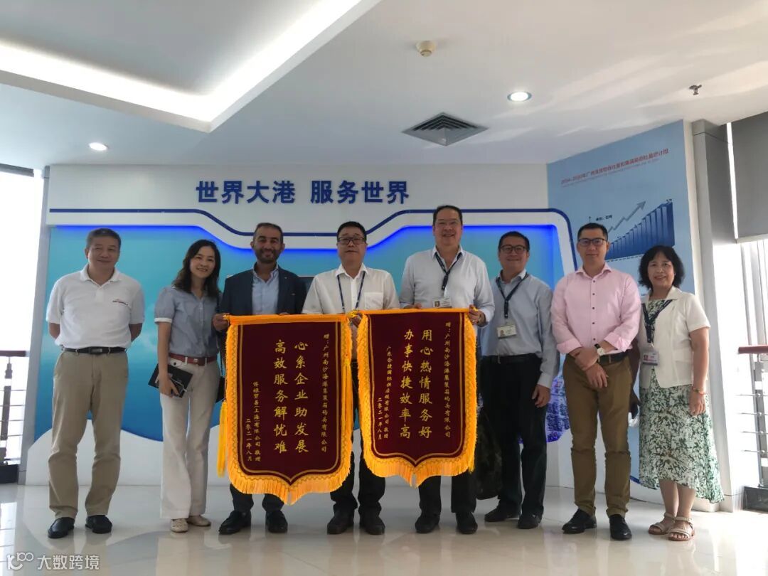 国庆前夕,博禄贸易(上海)有限公司供应链副总裁欧迪倍、物流经理张毓,以及广东合捷国际供应链有限公司总经理陈嘉年、副总经理李嘉伟一行,到访南沙港务海港。意在感谢南沙港务海港一直以来给予客户提供优质的服务,并在今年6月塞港期间,为VIP直客排忧解难。他们分别赠送锦旗以表谢意。