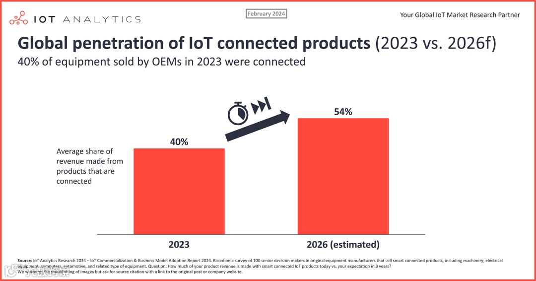 由于企业追求利润的本质,商业模式是一个永远不会过时的话题。就在近日,IoT Analytics 发布了最新版《2024 年物联网商业化和商业模式应用报告》,该报告调研了100家OEM厂商,以了解这些厂商在将其互联产品的规模扩展至数千、数万甚至百万量级时,有哪些经验教训和最佳实践?