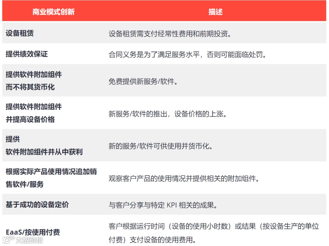 OEM厂商们面临的另一大挑战是使互联产品的收入具有意义。由于一些设备的成本达到数十万美元,相关软件的成本仅为此成本的一小部分,因此许多OEM仍在努力使互联产品的业务对公司的营收和利润产生足够的意义。解决这个问题的一种方法是设备即服务模式(EaaS),在报告中,EaaS正是最具创新性、也是最复杂的各种创新商业模式之一。