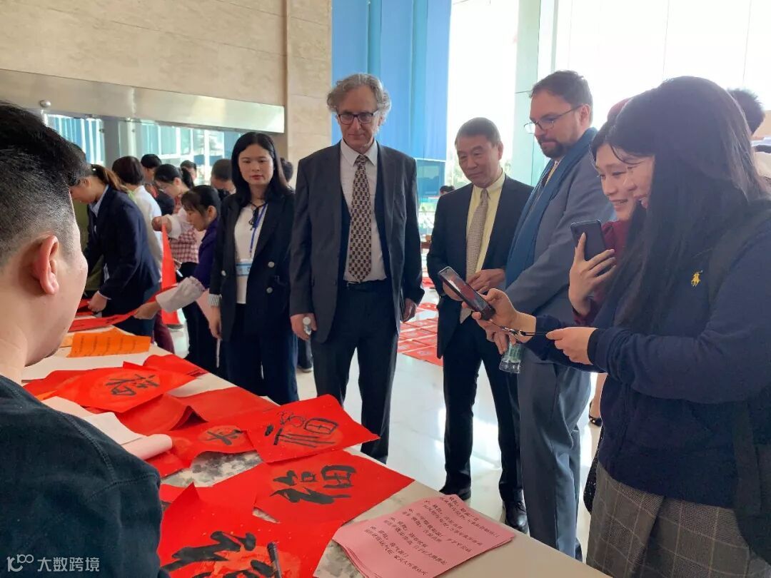 在排队的人群里,有两位高大的洋客人特别引人注目。原来他们是来访的客户,被“挥春送福”活动热烈的氛围吸引住了,跟着员工一起“接福”来了。当拿到书法家为他们书写的“福”字后,他们热情邀请书法家合影,两人还很老练地把“福”字倒着拿,寓意“福到”。一时间,很多职工、客人拿起手机,给他们留下珍贵的合影。