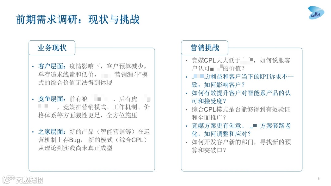 第一个部分定制工具,前期我们做了一个需求调研,发现客户在业务和营销两个方面都面临着非常艰巨的挑战。业务方面,客户的预算下滑以后,又遭受到了竞争对手前有狼后有虎的夹击;营销方面,主要是客户对过往比较成功的一些产品的信心开始动摇,包括销售底层的一些逻辑和产品背后的关键优势,开始打上问号。同时,竞争对手的方案更具有创意和冲击力。