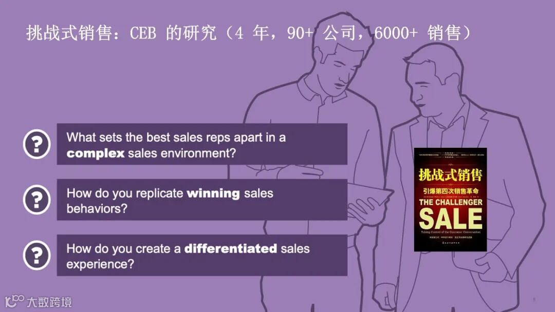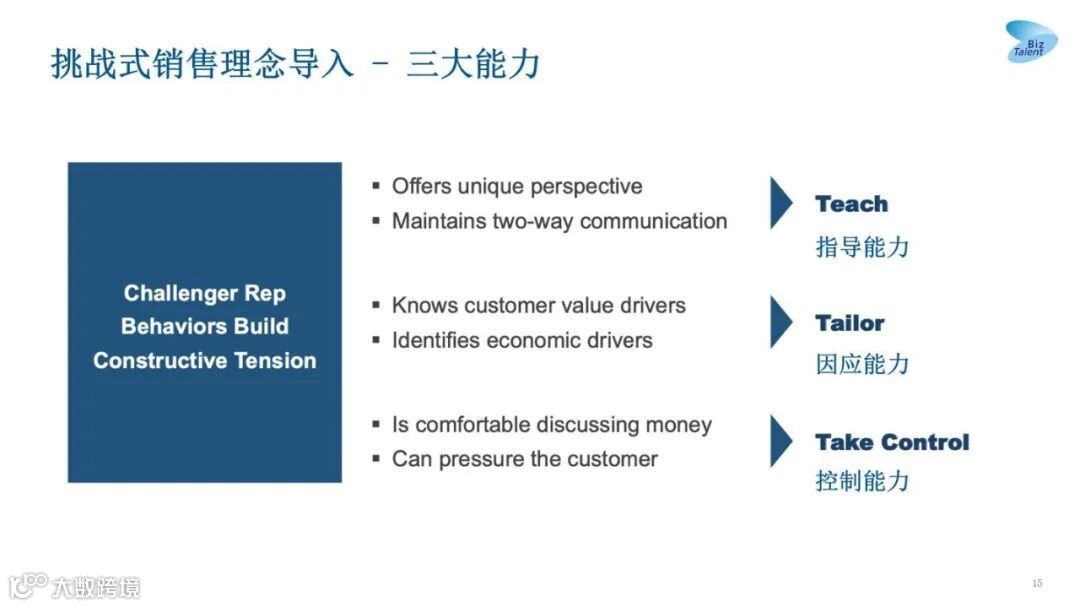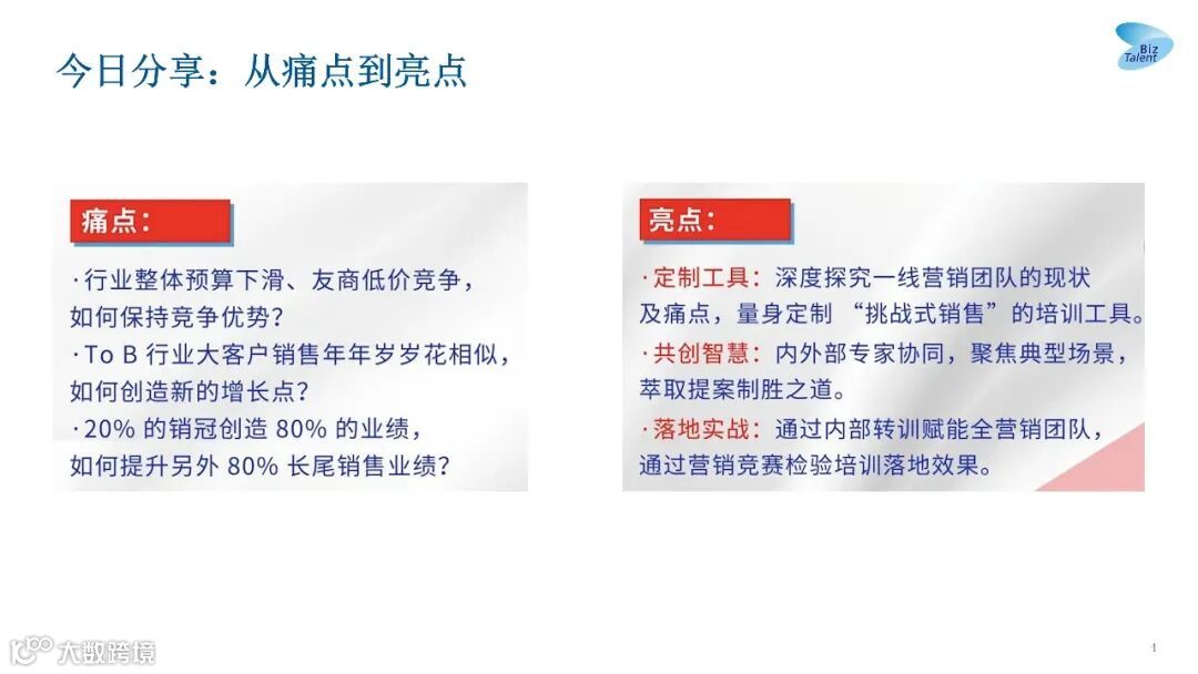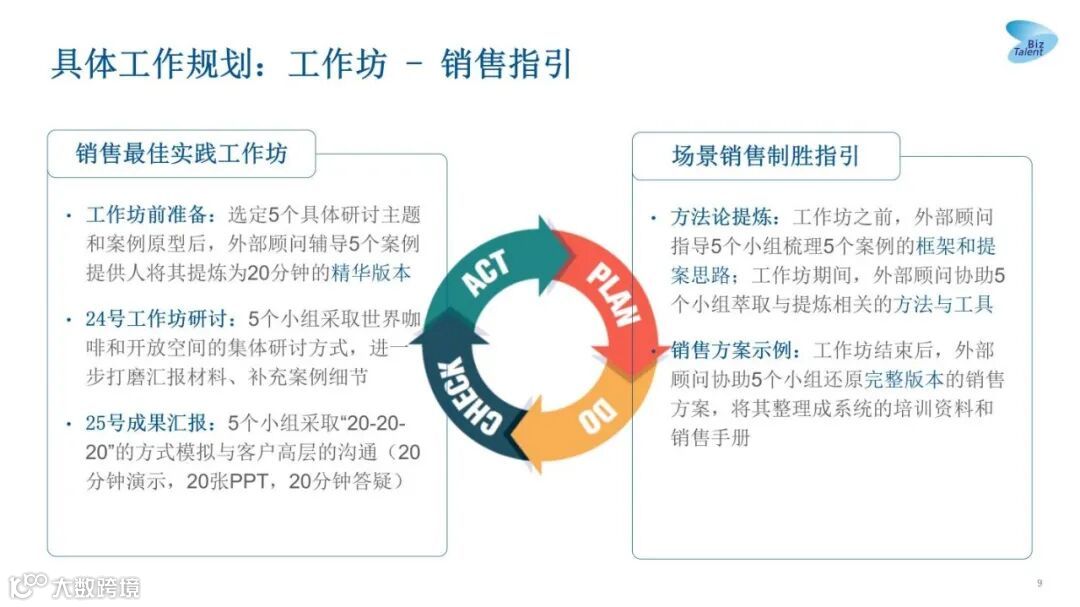 在这个项目中引入了《挑战式销售》的理念和相应的工具。具体的做法后面再来展开。之所以引入《挑战式销售》,是对于整个销售团队的判断:他们需要从传统的顾问式销售向未来的挑战式销售来转变,从而能够改变客户的认知,实现销售目标。具体来讲,我们通过一天的“销售最佳实践工作坊”,邀请了五个最优秀的销售冠军,围绕着五个最重要的产品来进行案例的分享,再把这些内容赋能到整个销售团队、大客户团队、营销团队中。
