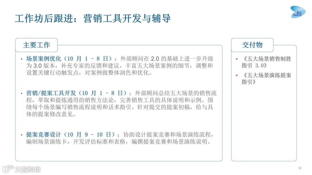 一天的销售最佳案例萃取并不是一个终点,反而是这个项目中的起点。工作坊结束以后,我们又做了三件事:分别是场景案例优化、营销提案工具开发和提案竞赛的设计。主要目的是把案例萃取的精华进行深度开发,提炼出一个成熟的方法论。变成一整套可以赋能普通销售团队成员的工具。后续要求所有的普通销售来学会这套工具,通过提案、竞赛的方式来检验他们是否真正的学到了挑战式销售背后的制胜的逻辑。