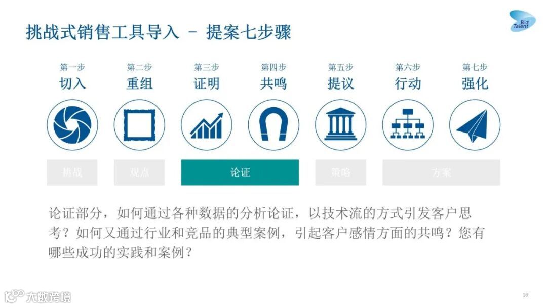 另外一个是方案本身,我们对于整个方案基于现场的分享,邀请所有的大客户的营销总监一起来研讨和碰撞,按照《挑战式销售》的逻辑,进行梳理。包括七个步骤,切入我们销售的主题;重组客户对于我们产品的认知;证明方案能够帮助客户解决卡点和痛点的。证明更多的是数据的方式偏理性。同时,也会来分享行业和竞品典型的案例,激发客户感情的共鸣。第三步和第四步是整个方案的成功的关键。随之再提出解决的方案。第五步,提议和激发客户采取具体的行动和项目实施的具体路线图。最后强化提案,要求客户在提案结束以后,需要做一些对接的动作以及希望达成的成果。