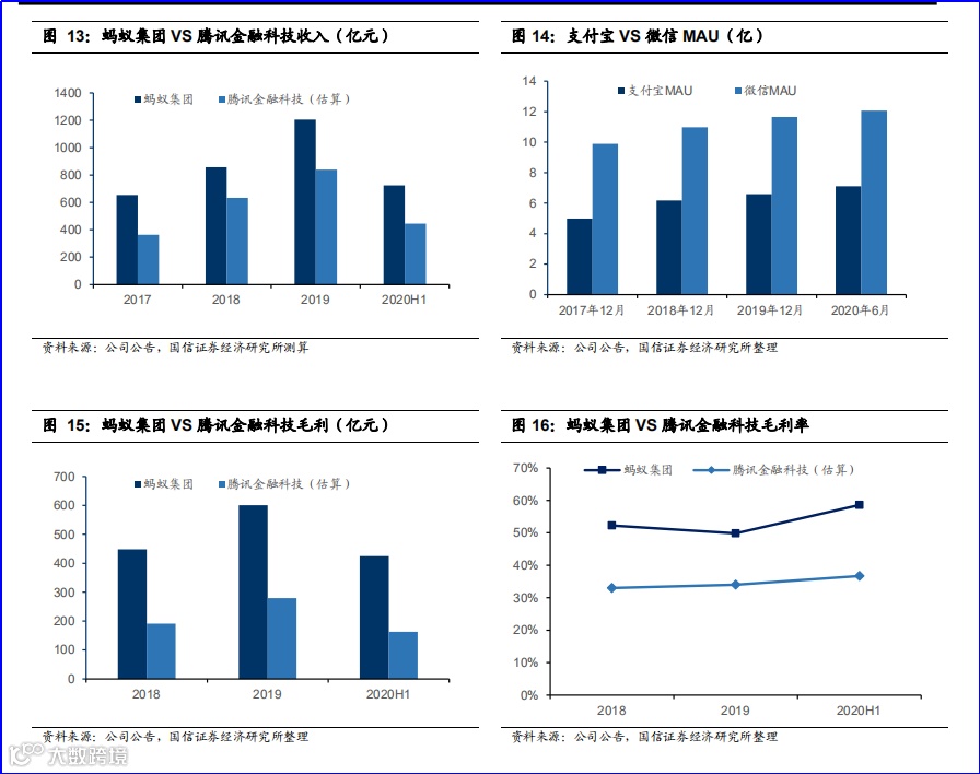 国信证券的研报估算,2018年-2020上半年,蚂蚁集团数字支付业务收入略低于腾讯金融的支付收入。