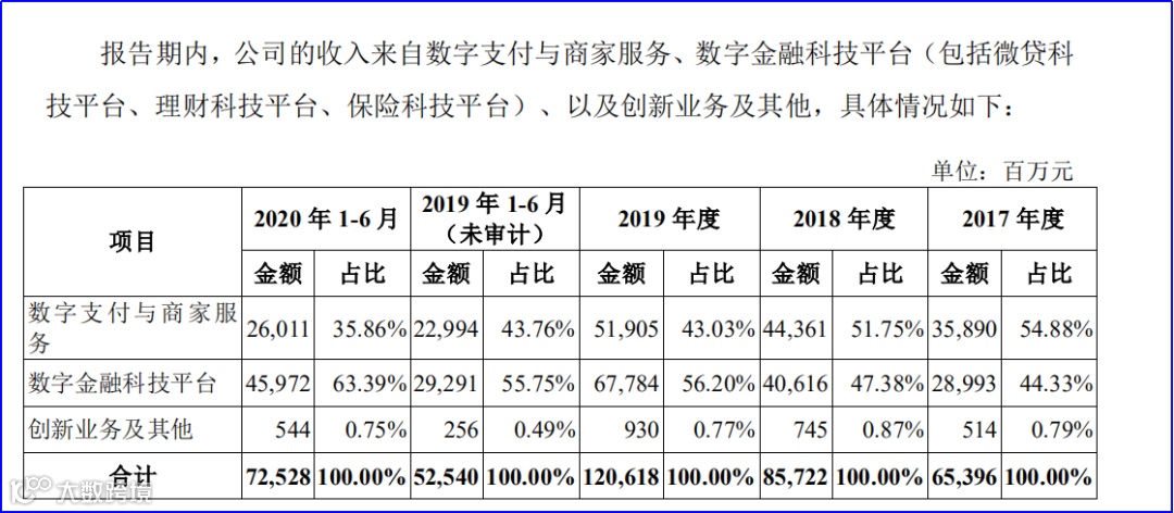 2020年1-6月,这一比例进一步下跌至35.86%,与此同时,技术服务收入即“数字金融科技平台”的收入比例提升至63%。