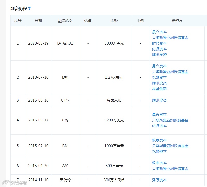 细数背后的投资方,包括晨兴资本、贝塔斯曼、腾讯投资、纪源资本等。但这几轮融资下来,几乎都是老股东持续下注跟投。其中银泰资本投资A、B两轮;贝塔斯曼连续下注5轮;晨兴资本投资3轮;纪源资本下注4次。