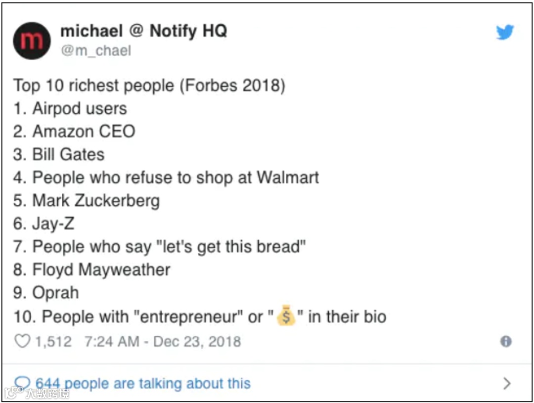 被苹果内部赋予厚望的AirPods,就这样不温不火了两年,直到2018年,Twitter上的一个关于十大富豪榜单的帖子突然火了。在网友的调侃中,AirPods用户成为富豪榜单里的王者,连亚马逊CEO、比尔·盖茨、Facebook老板马克·扎克伯格、 世界级名嘴奥普拉这些商界、演艺界名流都只能靠后站。有才青年开始各种玩梗,一系列针对AirPods的恶搞海报、表情包接踵而至,源源不断地为AirPods免费生产话题。网友的嘲讽脑洞玩出了各种花样,引发了现象级的meme,这才把AirPods彻底带火了。
