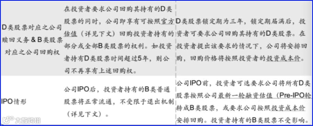 关于D类股(即无利债),在三年锁定期满后,投资者可要求大疆进行回购,价格按投资成本价计。